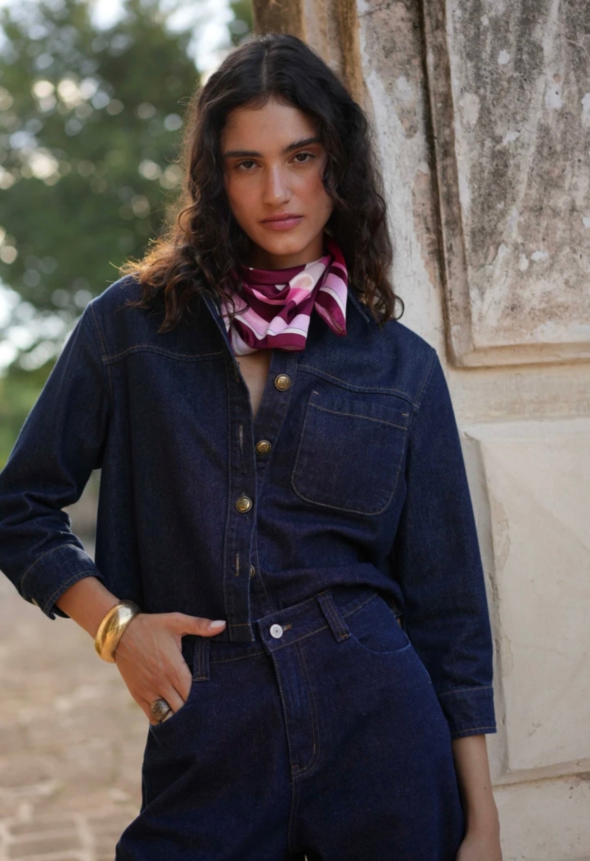 The Calista is a short denim jacket, enhanced with contrasting stitching and engraved golden buttons. Featuring a chest patch pocket, it reinterprets workwear spirit with a feminine and contemporary touch.