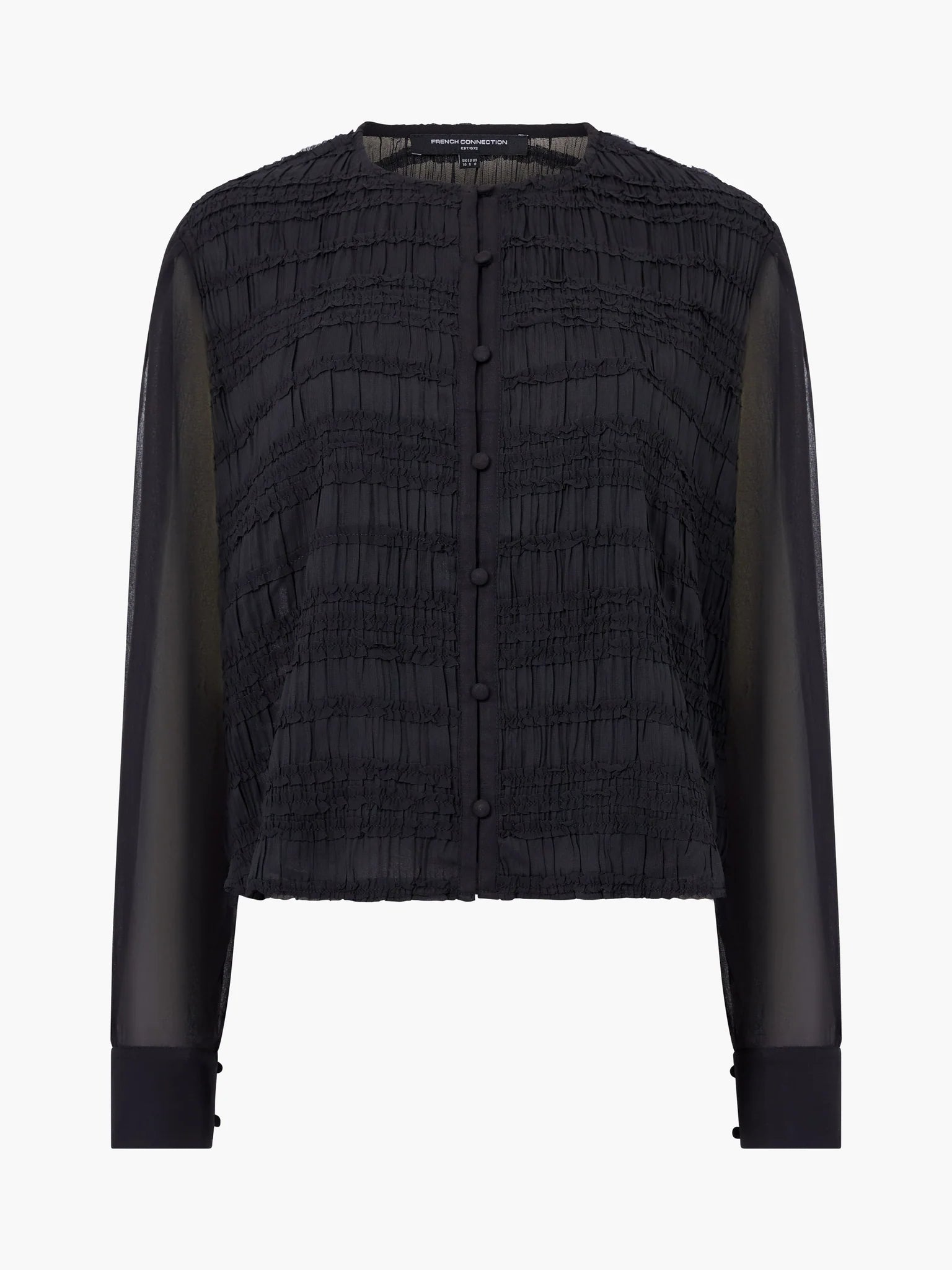Texture meets transparency. Our Canary Pleated Long Sleeve Shirt features a semi-sheer sleeve design and softly structured bodice with all-over puckered pleats, finished with fabric-covered buttons for a refinished finishing touch.