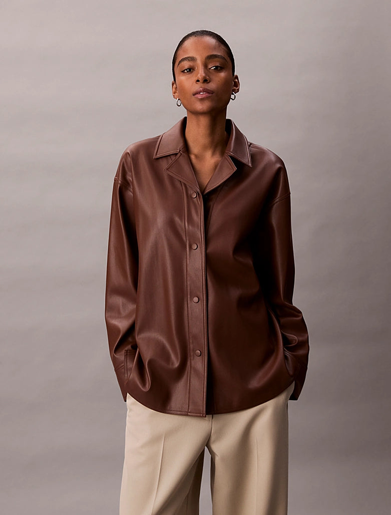 Tailored, with an edge. A classic shirt reimagined in smooth faux leather with a relaxed fit for modern layering.