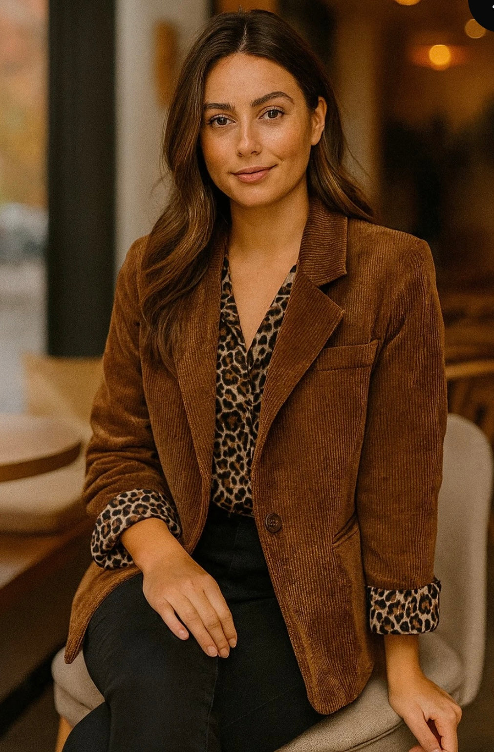 Long-sleeve blazer with notched lapel. Leopard print lining for a bold touch. Handy front pockets and roll-up sleeves. Perfect for a chic and confident style. One size fits 36-42 Amy&clo Paris.