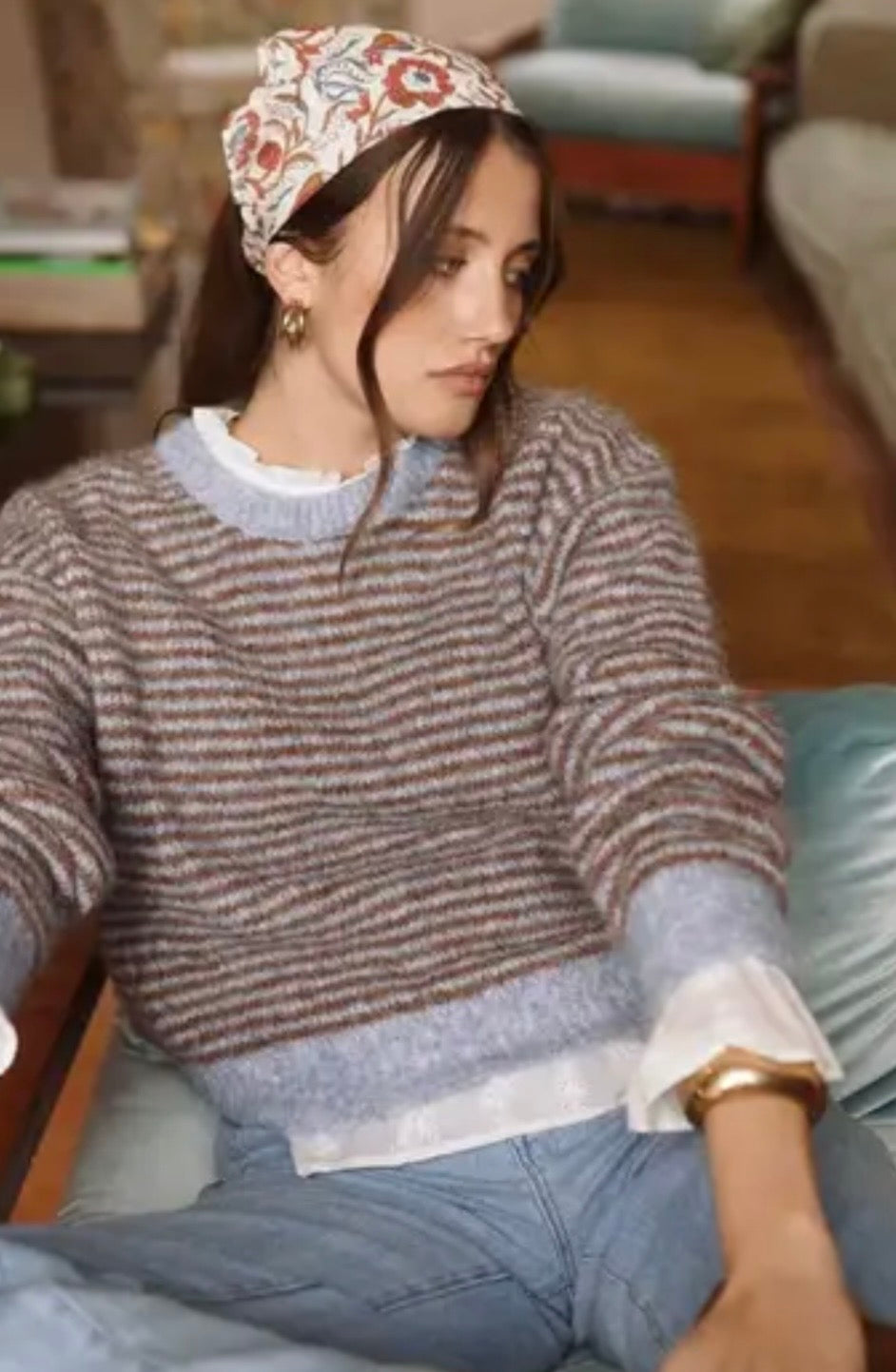 Model with contrasting fine horizontal stripes, offering a warm and timeless look. Slightly loose straight cut for comfortable wear. Round...