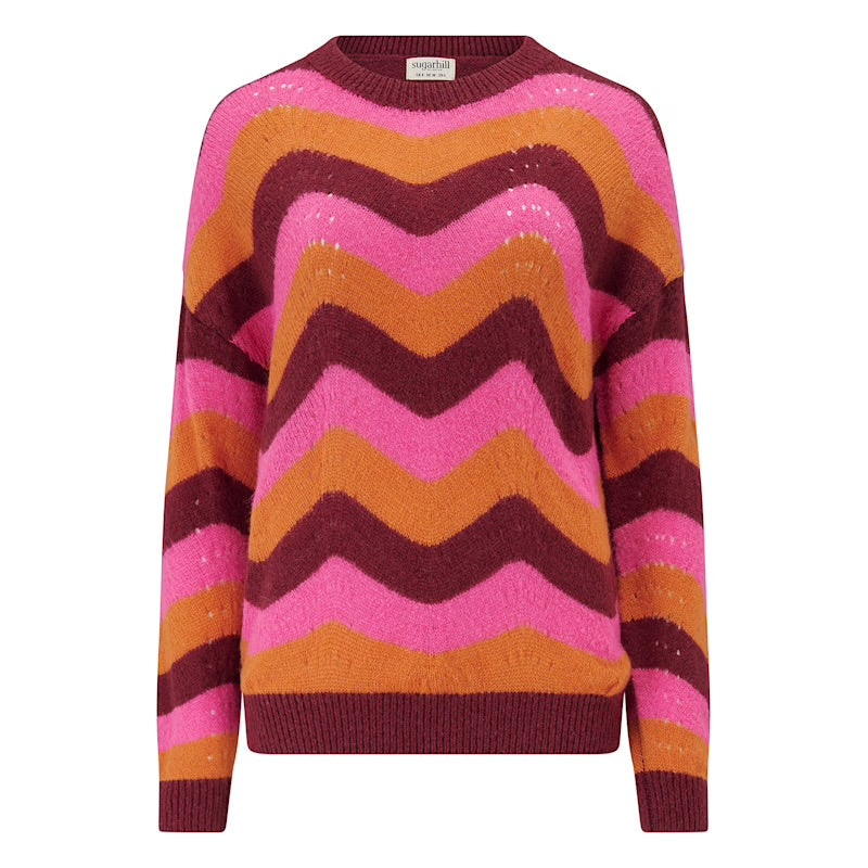 The Evaline Jumper is a bold and playful knit designed to brighten your wardrobe. Featuring retro-inspired wavy stripes in pink, orange, and burgundy, this jumper is elevated with pointelle accents that add subtle texture and charm. With its relaxed fit and vibrant colour palette, the Evaline is perfect for layering or making a statement on its own.