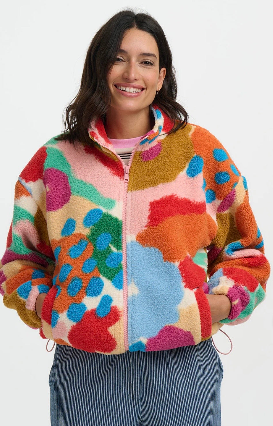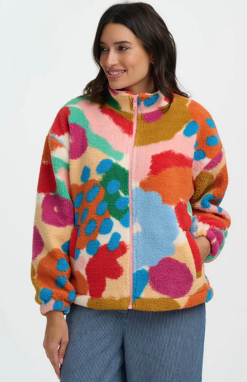 Introducing the Hartley Fleece, back for a fresh new spring style. This cosy zip-up fleece is designed with a relaxed fit, making it the ultimate layering piece for cooler days. The standout design features colourful abstract brushstrokes and bold dotted accents that blend with a textured, painterly feel. With its soft texture and bold print, the Hartley combines warmth and statement style effortlessly.