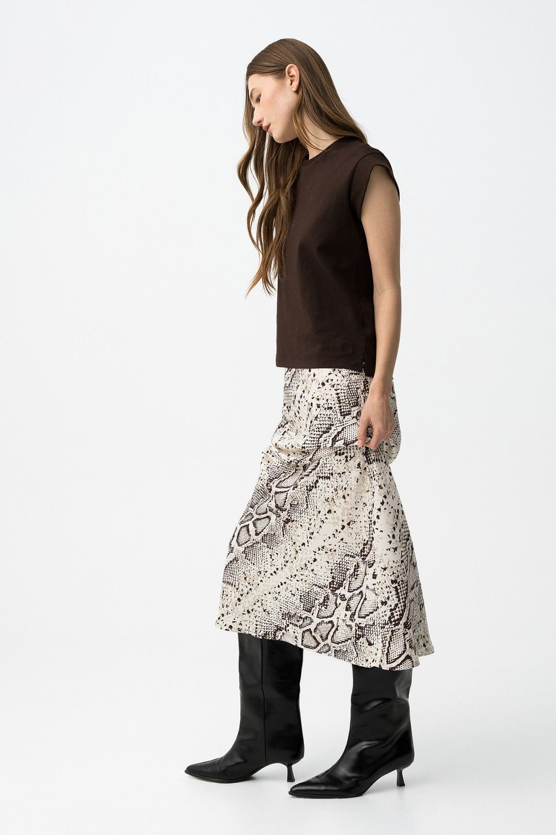 Midi skirt in beige with animal print, regular fit and high waist, casual chic vibe.100% POLYESTER