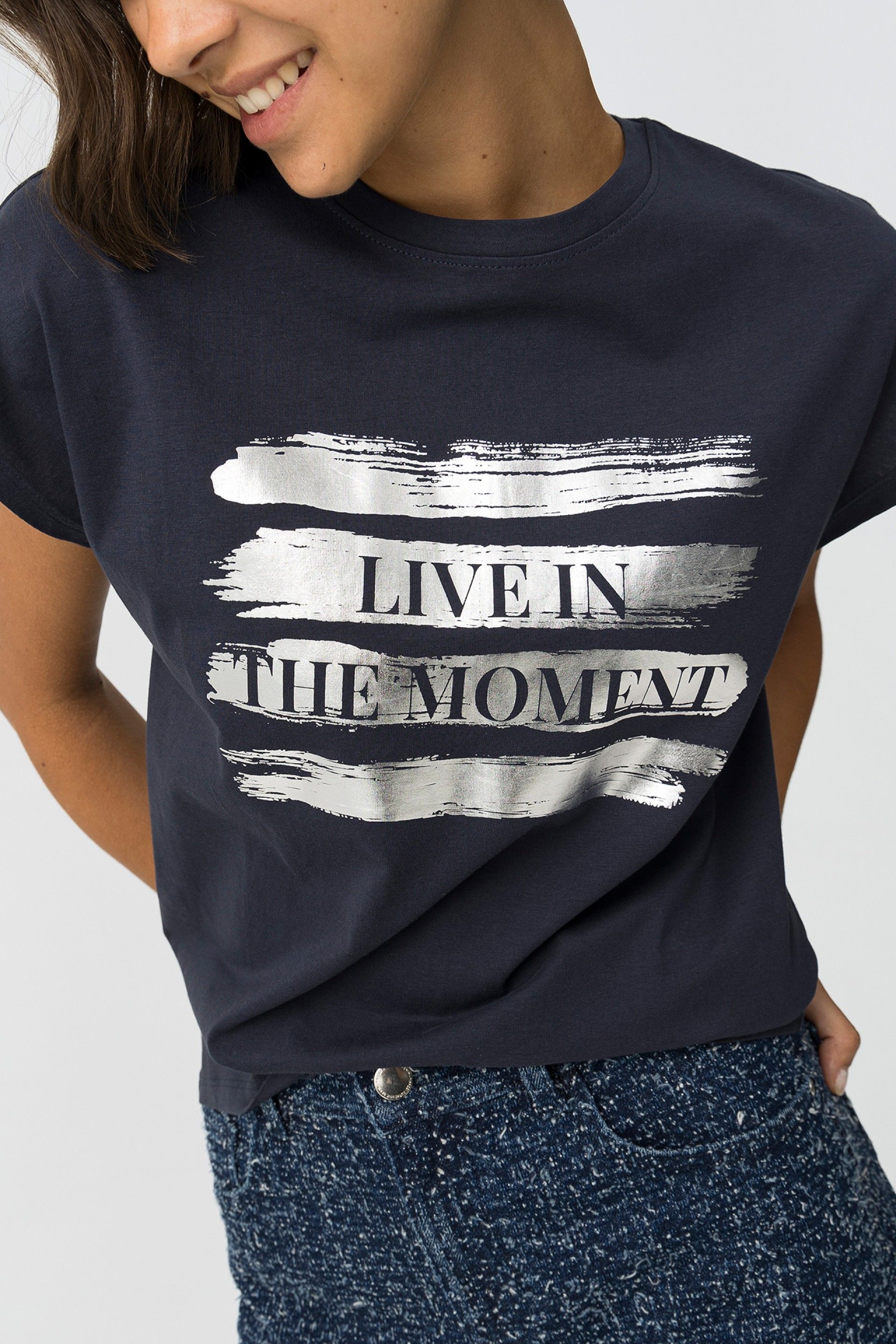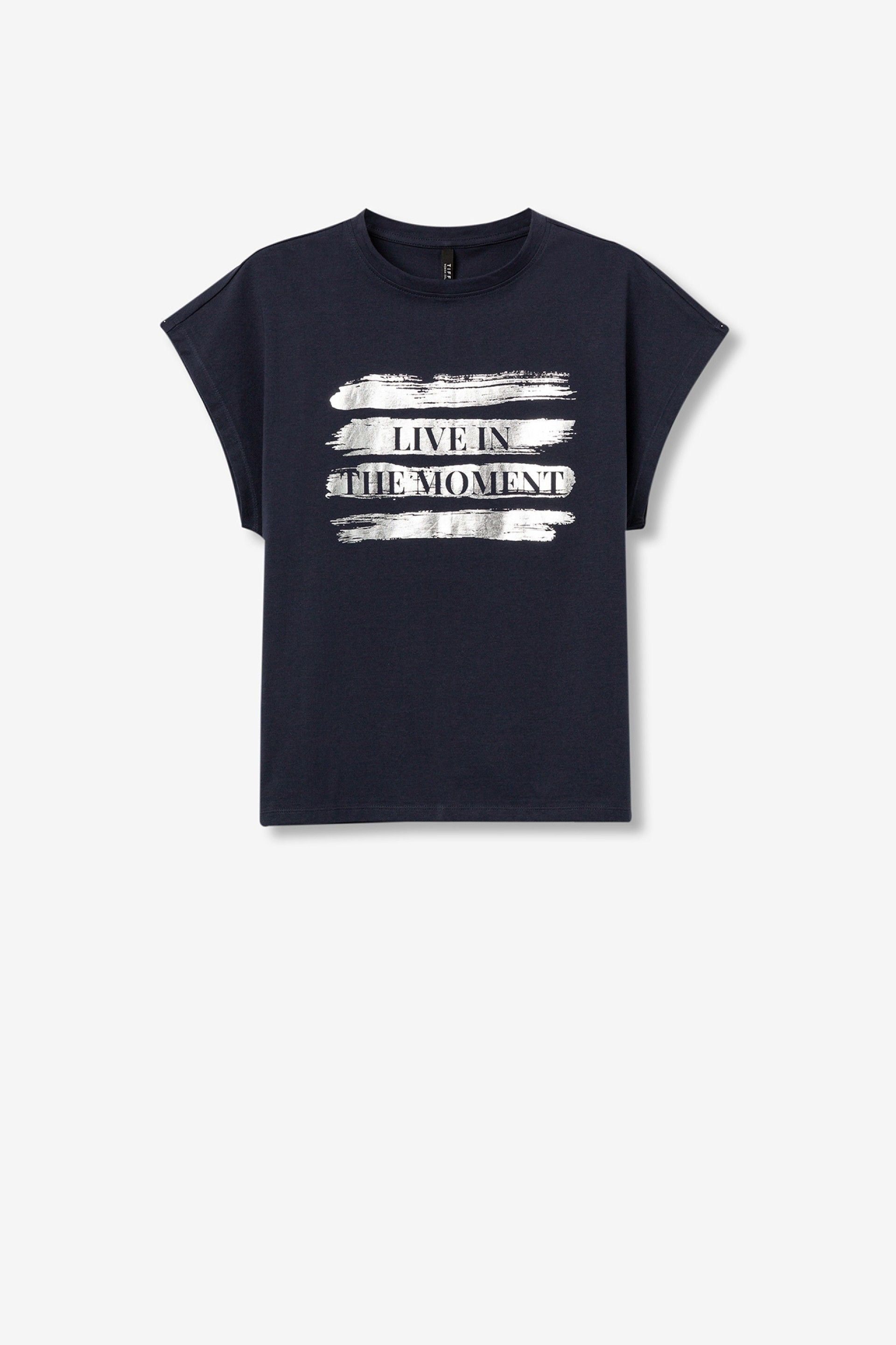 Regular fit cotton T-shirt with metallic front print, round neckline and short sleeves.