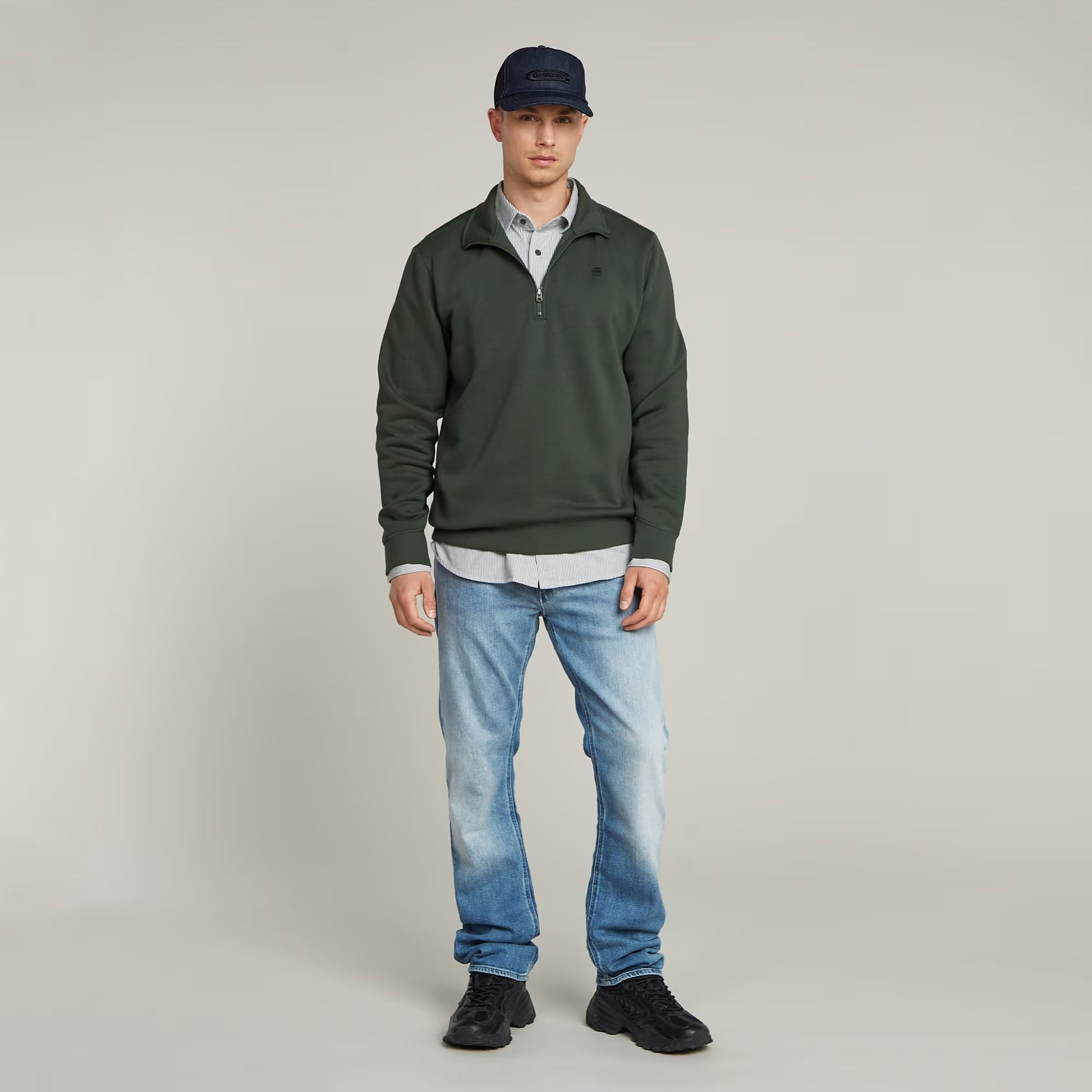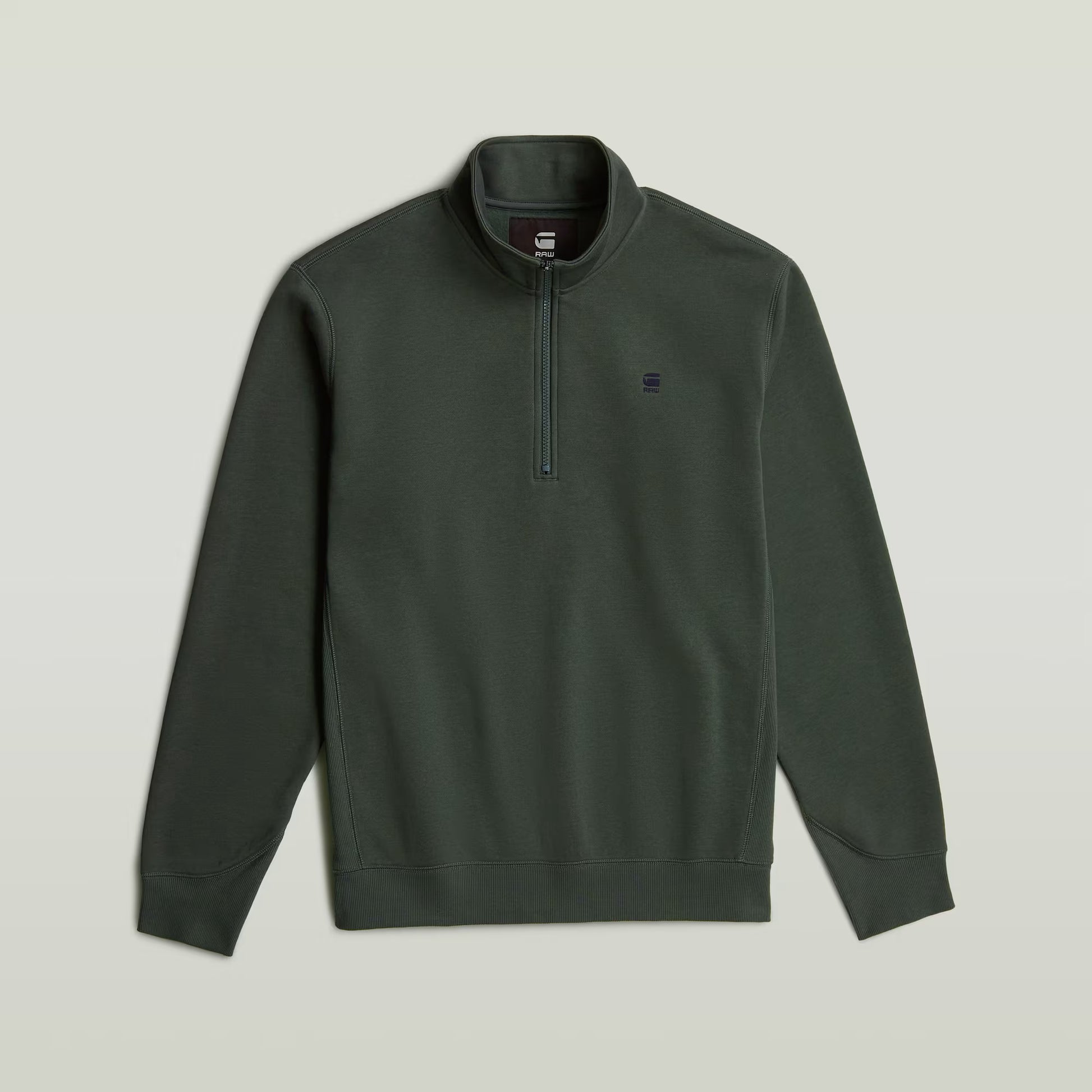 Half zip sweater Premium Core offers a raised collar. The sleeves show a curved finish with a ribbed cuff underneath. Also the sides and bottom edge are created out of ribbed fabric.