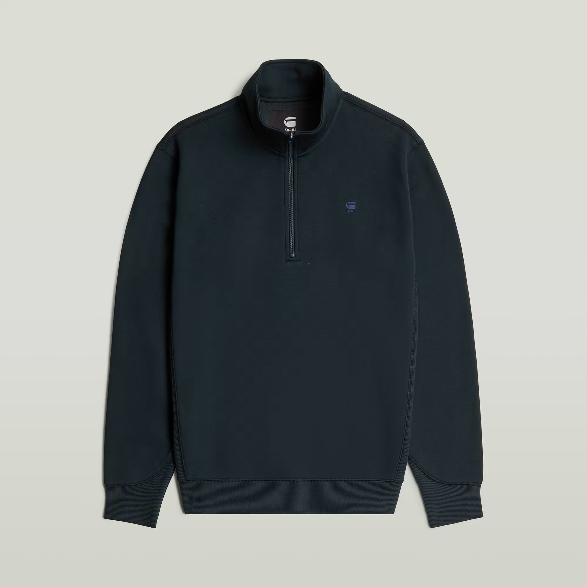 Half zip sweater Premium Core offers a raised collar. The sleeves show a curved finish with a ribbed cuff underneath. Also the sides and bottom edge are created out of ribbed fabric.