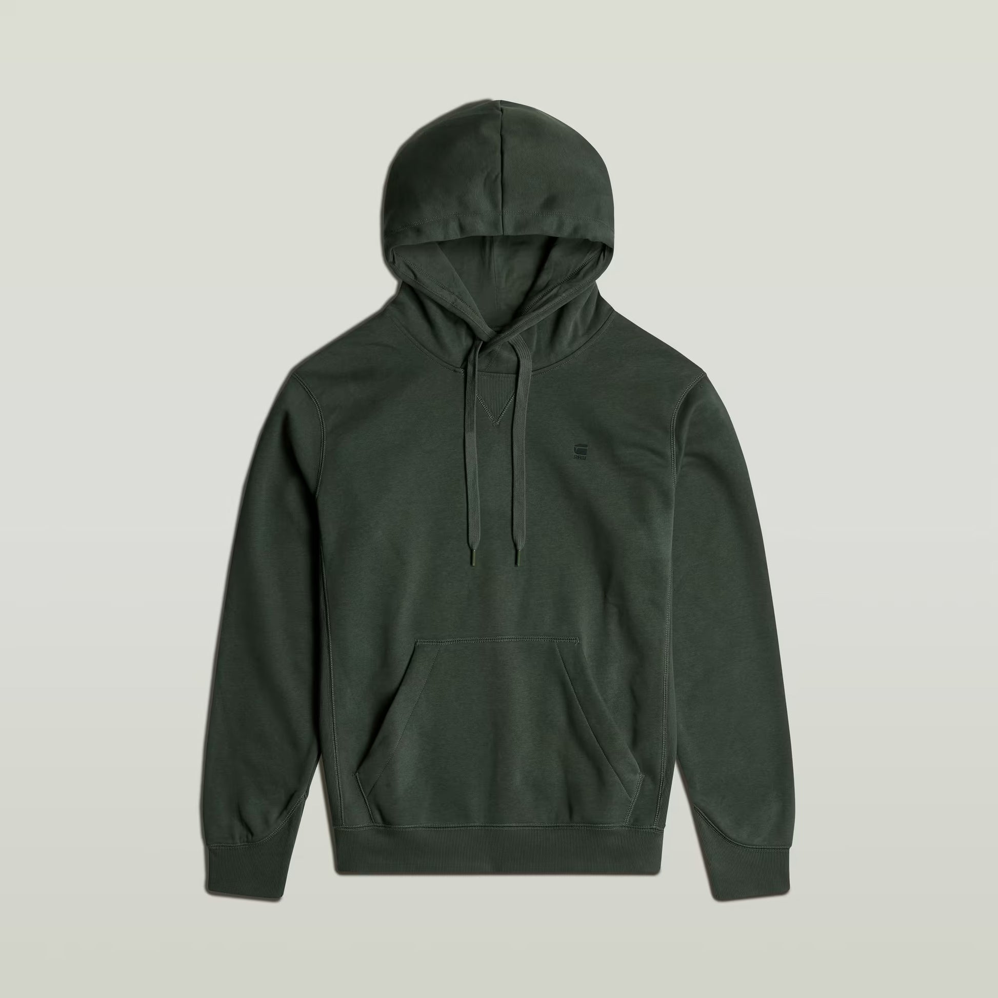 The Premium Core hoodie features a hood with a cross over construction and a ribbed inset piece. The long sleeves have a curved finish, showing a ribbed cuff underneath.