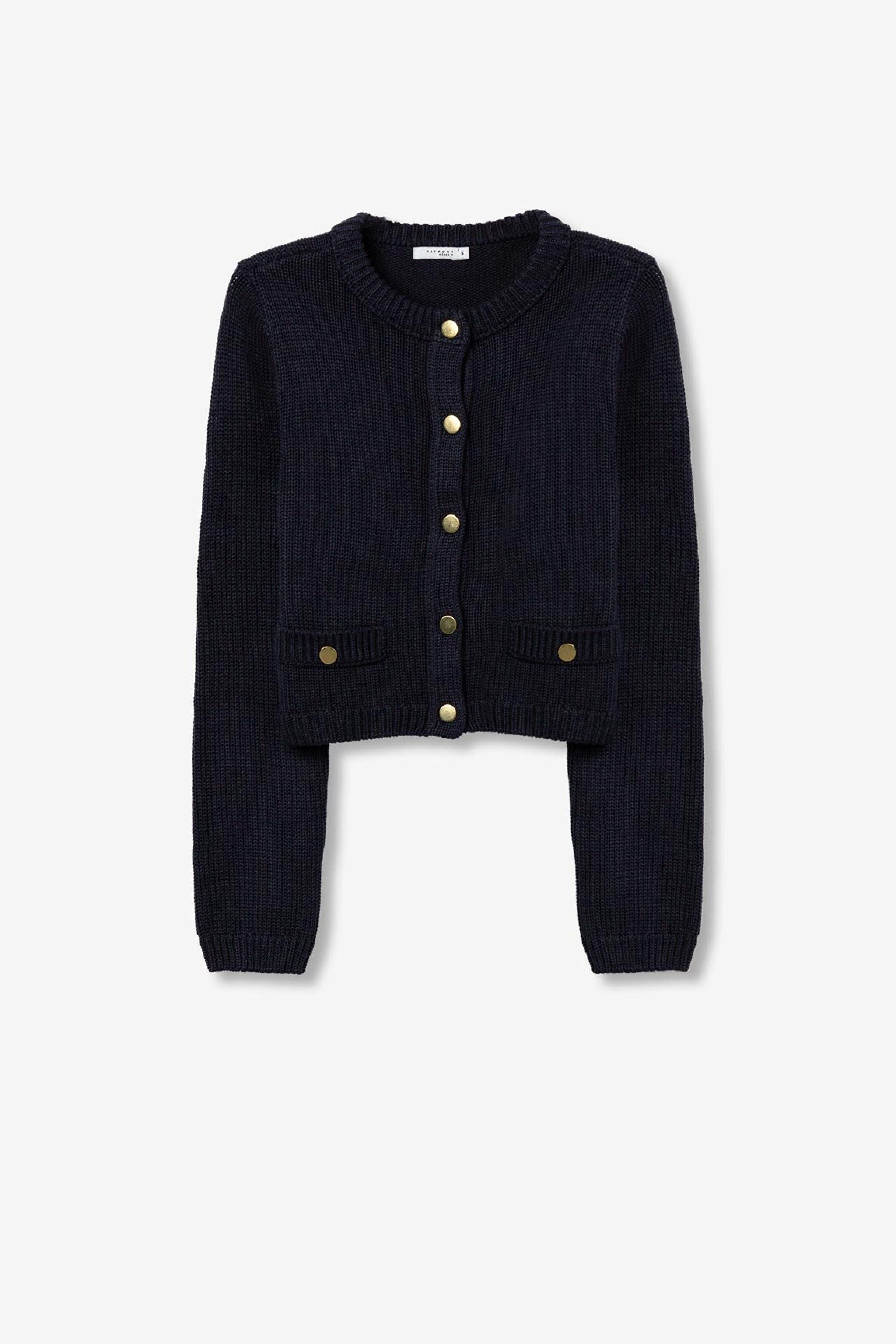 Regular fit cardigan with two decorative front pockets and metallic buttons. Round neckline and long sleeves.