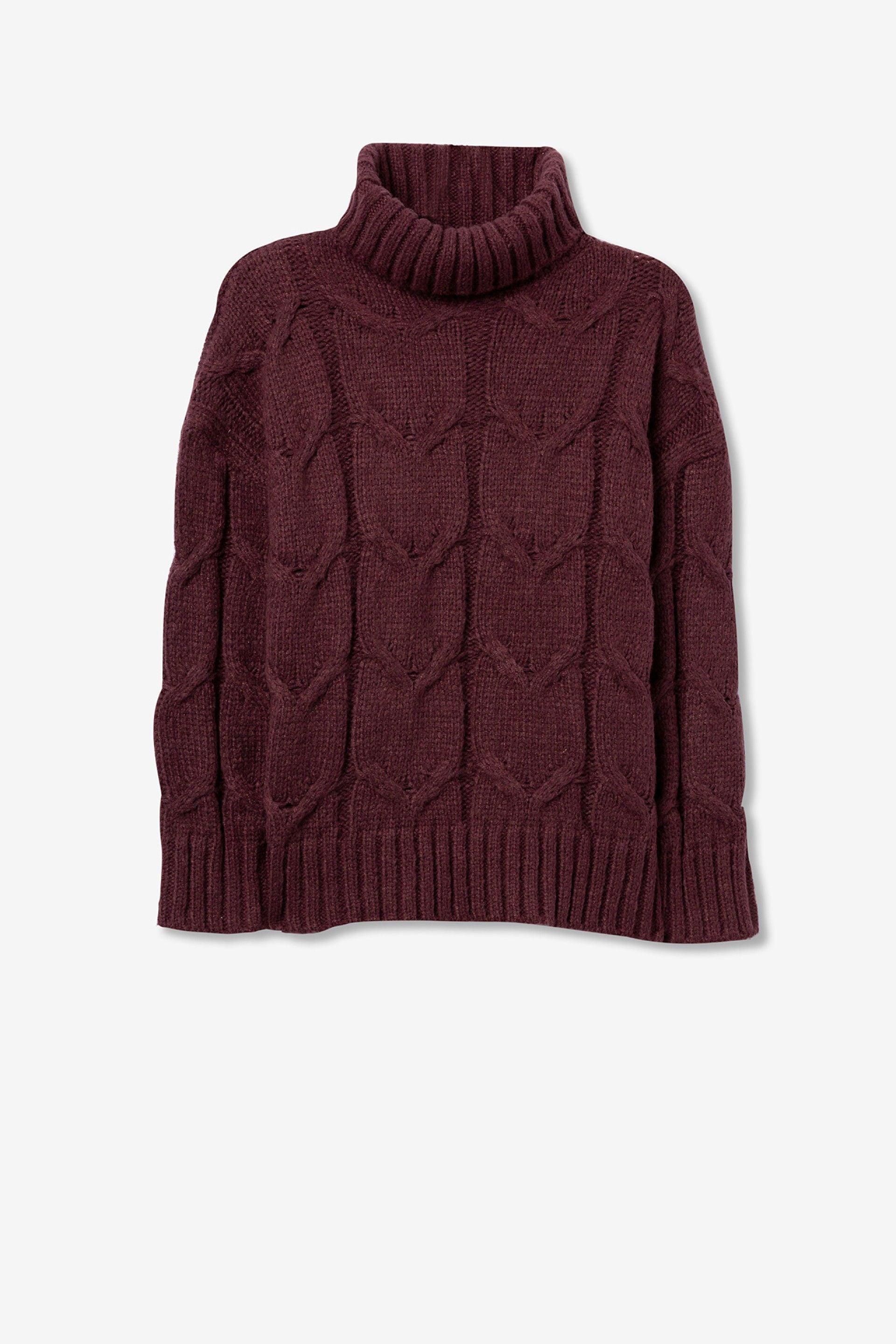 Relaxed fit cable knit sweater with high neck and long sleeves.